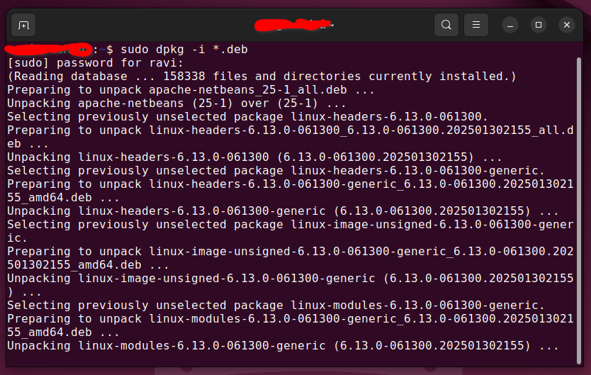 Depois de baixar todos os arquivos do kernel acima, instale-os usando o gerenciador de pacotes dpkg, que instalará todos s arquivos .debo baixados de uma só vez.